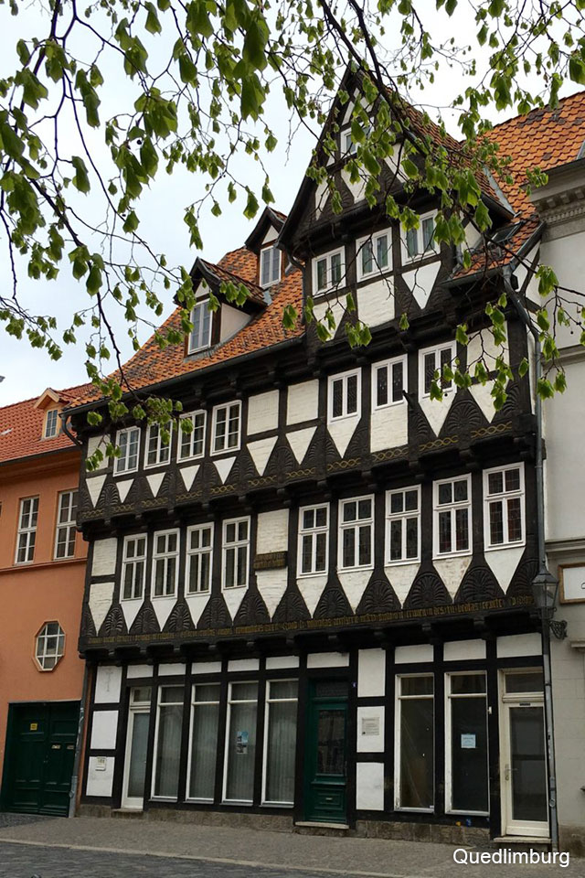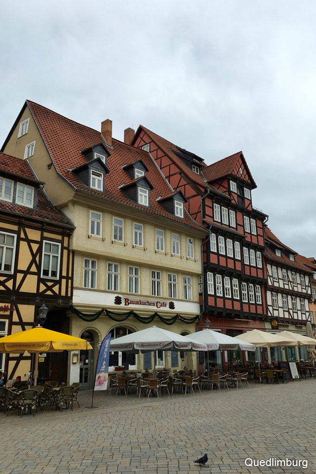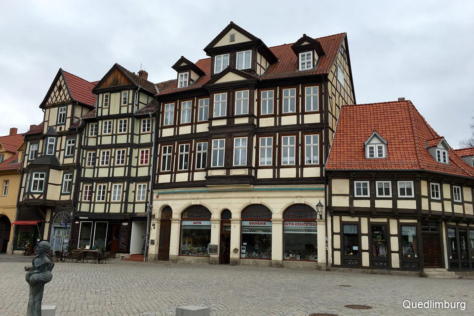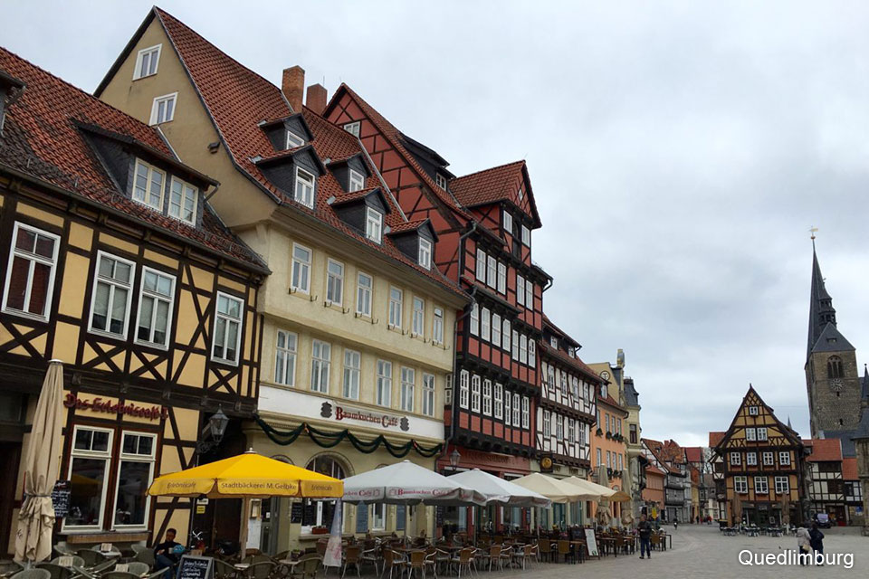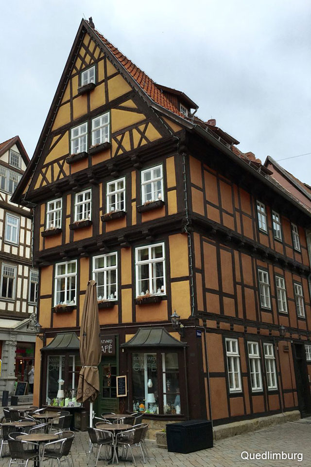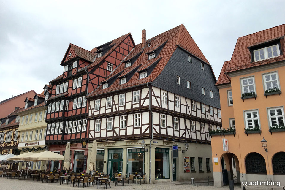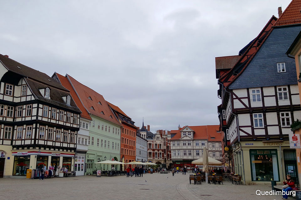 Quedlimburg es una pequeña ciudad, que quedó casi sin tocar durante la Segunda Guerra Mundial y también durante los años de régimen comunista, en esa parte de Alemania. Después de reunificarse Alemania en 1989, comenzó su restauración y fue declarada por la UNESCO, en 1991, como Patrimonio de la Humanidad. Generalmente con ese título que otorga la UNESCO, los habitantes originales ven que sus propiedades aumentan su valor y entonces, las ponen en venta y se mudan. Las plantas bajas de las casas vacías se alquilan para comercios y se va llenando de locales de souvenirs y de lugares para comer y el carácter original de la ciudad, pasa a constituirse en una especie de paseo turístico. A pesar de esto, Quedlimburg es realmente hermosa, con una calidad y cantidad de situaciones urbanas que son un placer de recorrer y poder admirar la proporción irregular (pero perfecta) de las construcciones, que están realizadas con las técnicas constructivas de la Edad Media, cuando Quedlimburg pertenecía a la Liga Hanseática.