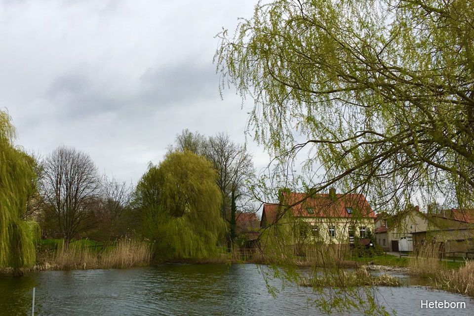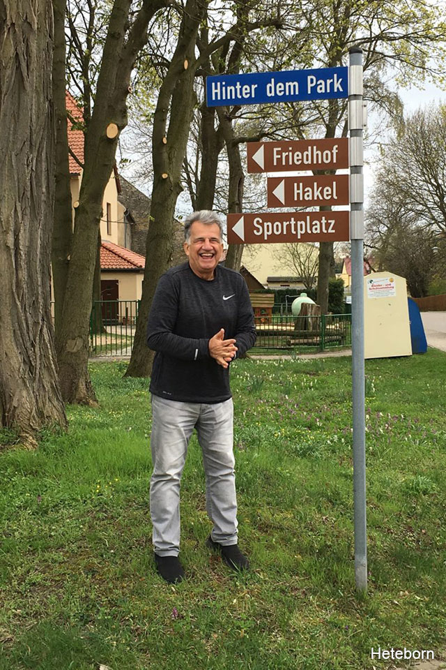 Sabíamos que la estación de tren mas cercana al «Hakel» era en Halberstad, pero no había certeza de que manera acceder desde allí al «Hakel» y el Google Maps tampoco era claro al respecto. En Berlín, conseguimos el último ejemplar de un mapa de la región, que se había impreso para una asociación de biking. Con ese mapa vimos que el acceso al «Hakel», era a partir del pueblito llamado Heteborn. En Halbertadt contratamos un taxi. El chofer del Mercedes 350 (casi 0 KM), nunca había ido al «Hakel» y de Heteborn, solo había escuchado su nombre. Al llegar a Heteborn, no encontramos en el lugar a absolutamente nadie. Dimos vueltas buscando a alguien para preguntar, pero fue infructuoso, hasta que de repente, en algo similar a una plaza, apareció un cartel, indicando con distintas flechas : para allá al cementerio; para allí al campo de deportes; para ese otro lado al «Hakel». Por supuesto, nos sacamos las fotos de rigor junto al cartel con nuestro apellido y luego, a los diez minutos de marcha, estábamos en la entrada del «Hakel».